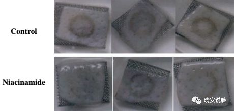 另一种则更接近实际场景一丢丢,在色沉表皮模型上进行(一种专门用来做实验的带有色素沉着问题的人造皮肤),结果当然也是不错的,能看到加了烟酰胺的明显比不加的色沉有减淡: