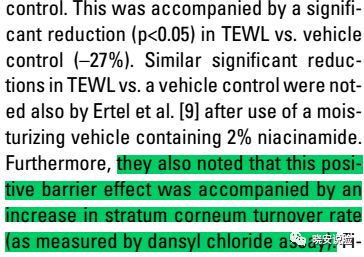 这篇综述里终于再次提及了烟酰胺能去角质的内容!!!且给出了源文献,还描述了证明方法。好巧不巧的,那方法还就是我最熟悉的丹磺酰氯荧光标记实验!!!一个被广泛采用的检测表皮细胞更新速度的实验(你可以理解为这个实验可以比较直观的检验某个成分是否有角质剥脱的作用)!!!没错了,就是它!!!