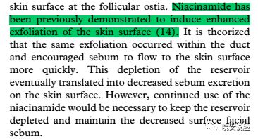 这是2006年发表于Journal of Cosmetic and Laser Therapy的《The effect of 2% niacinamide on facial sebum production》,主要讲烟酰胺的控油功能,其中对烟酰胺控油机制的推测是:与促进角质剥脱有关!(很多人反映果酸用了以后感觉出油变少了,我一直百思不得其解,一般的文献里也没有解释,甚至没有提到有这个功能。。。这段话也为此提供了一个新思路)