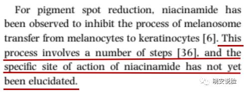 “烟酰胺被观察到了可以抑制黑素从黑素细胞向角质形成细胞的转运过程。不过,这个过程包括了很多步骤,具体烟酰胺的作用在哪一步尚有待阐明”。