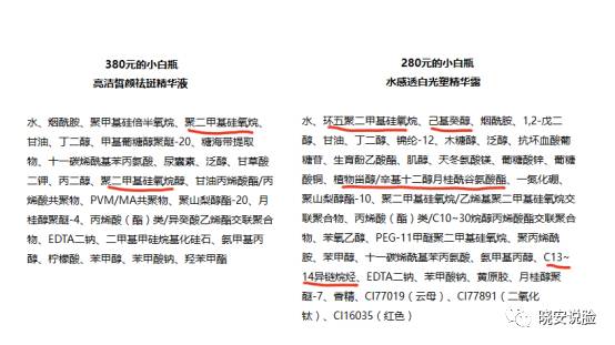 聚二甲基硅氧烷:就是一般所说的硅油,特点是虽然的确是油,但涂抹到皮肤上却没有油腻感,也没啥锁水封闭的作用,所以这个成分排名靠前的产品十之八九是个对干皮没啥意义对油皮比较友好的东西。
