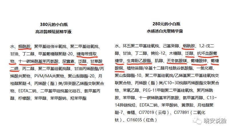 相同点:都有烟酰胺、十一碳烯酰基苯丙氨酸(也是一种美白剂,经常和烟酰胺联用,据说联用的效果更好)和泛醇;都放了收敛剂。