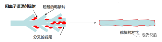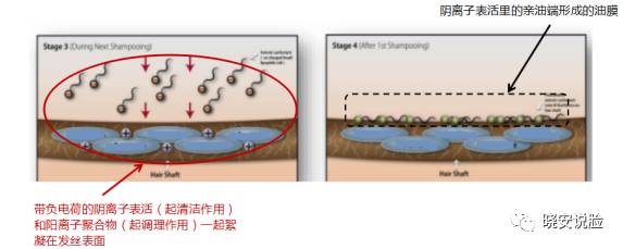 洗发时,阳离子聚合物(调理作用)均匀吸附于带负电荷的受损头发发丝的表面,这时候发丝呈现正电性。然后,原本起清洁作用的阴离子表活在阳离子表活的吸附作用后也会被发丝吸引,形成絮凝物。只不过,这个絮凝过程中,阴离子表活SLES中的疏水端(亲油性的)会覆盖在发丝表面,形成一个疏水层(你可以理解为油膜,保护发丝,也是一种调理作用)。