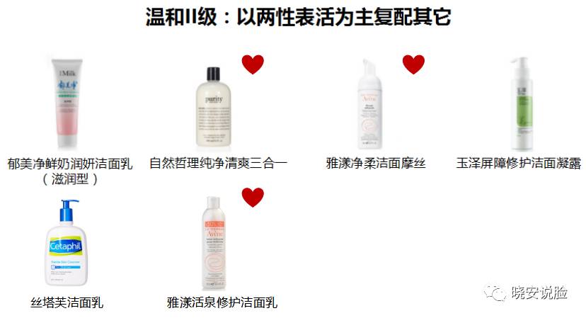 图片中挂了桃心的是肤感比较清爽的,也就是大多数人会觉得“啊,洗的很干净啊”的那种,比较讨喜;其他属于滑腻范的,也就是大多数人感觉总也冲不干净似的那种。当然,肤感并不能决定清洁力,这个我前面说过了,不要想当然的划等号哦~