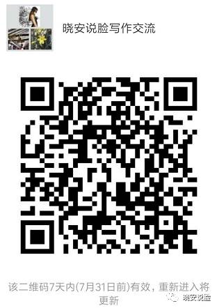 嗯~我现在的希望是可以有尽可能多的有一定天赋的宝宝和我们一起并肩作战。所以,我拉了一个群——晓安说脸写作交流。之前报名过的宝宝可以长按识别下方二维码进群或留言我你的微信号我拉你进群,后续事宜咱们进群后统一说。