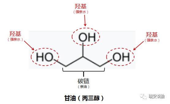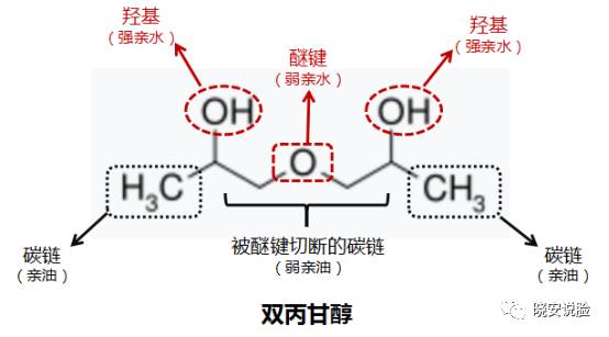 从图上可以很明显的看出,甘油的碳链(亲油性)比双丙甘醇要弱势很多,但却硬生生的挂着三个大羟基(强亲水),而双丙甘醇的亲油性阵容则强大很多:2个强势碳链(亲油性更强)+1个弱势碳链(被醚键断开了,如果不断开的话,就更厉害了),亲水性比起甘油来,也更弱势——只搭配了两个羟基。或者说,双丙甘醇虽然是以亲水为主基调,但对油性物质也是亲和力满满的,而甘油却是基本被亲水基团完全覆盖了,以致于亲水性表现过于强势,而难以接纳很多油性物质。