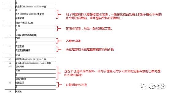 比如上图中大括号框住的成分其实都是半成品原料,像序号3里的水、大麦提取物、苯甲酸钠就是一种半成品原料,也就是加了防腐剂的大麦提取物水溶液,这样的成分一般在化妆品包装上的成分标识里是分开写的,水会写的很靠前,而苯甲酸钠是防腐剂,当然是很靠后的: