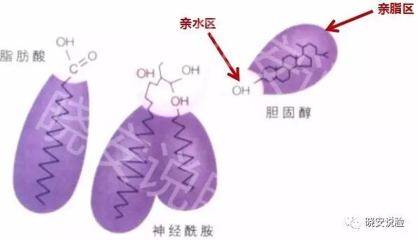 PS:实际上,这几种脂质也并非完全亲油的,而是两亲性的(既亲油也亲水),因为它们的化学结构上也有亲水基团,所以说对水也并非完全排斥,只是亲水基团相比它们的亲油基团来说过于弱小,所以宏观上显现不出亲水性质而已: