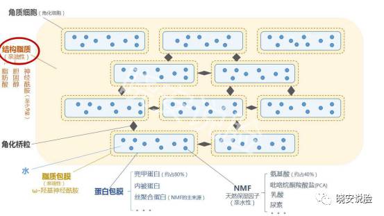 角质层的“砖块”——角质细胞,主要是多种蛋白质包裹着NMF(天然保湿因子)的亲水性成分,而外面的“砂浆”则主要是亲油性的结构脂质——脂肪酸、胆固醇、神经酰胺。