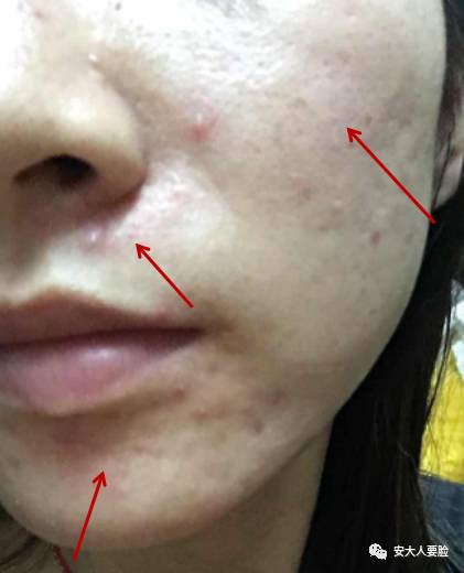 请注意看红箭头指向的部位!讲真?正常情况下,就算涂上10%的甘醇酸,可能会有轻微的刺痒感,也不会这样发红...因此,本来已经准备关电脑睡觉的我,不得不紧接着问她使用的具体情况。