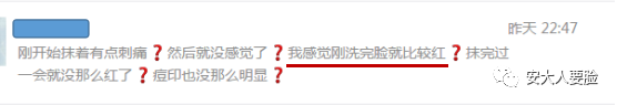 注意看红线上的话“刚洗完脸就比较红”,这点完全印证了我的猜测,这姑娘的敏感问题如果按照我的非权威排序,最少已经处于中度以上级别,竟然用了这么高浓度的果酸也觉得还好,只能说这姑娘的皮肤底子是真不错啊...