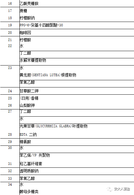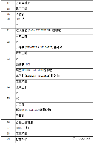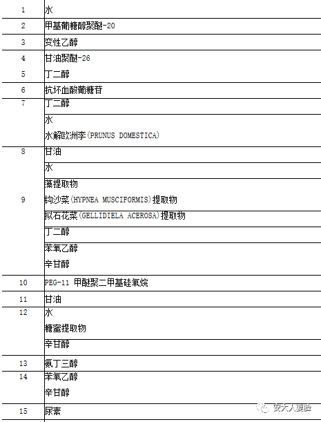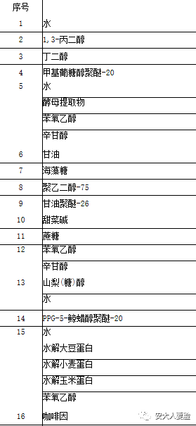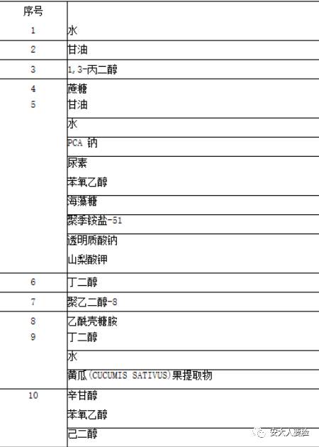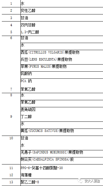 保湿剂:甘油、双丙甘醇、丙二醇、乳酸钠、PCA钠、海藻糖、聚乙二醇、乙酰壳糖胺、透明质酸钠、丁二醇