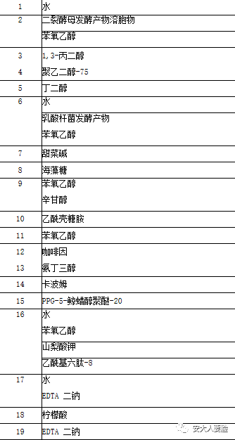保湿剂:1,3-丙二醇、丁二醇、甲基葡糖醇聚醚-20、甘油、海藻糖、聚乙二醇-75、甘油聚醚-26、甜菜碱、蔗糖、山梨(糖)醇、乙酰壳糖胺、PCA 钠、壳糖胺、乙基己基甘油、透明质酸钠、泛硫乙胺