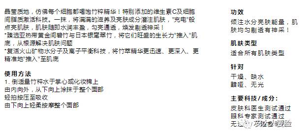 功效性成分方面担纲主角的是二裂酵母发酵产物溶胞物和乳酸杆菌发酵产物。因为这两个成分的化学组成和SKII的Pitera很相似,所以很多人说这是SKII神仙水的替代品。的确,它们的主要组成也是氨基酸、矿物质、维生素和有机酸,只是暂时安大人还没有找到相关的更加详细的资料,以后找到了再仔细八,现在请先参考神仙水Pitera的解析:1000块的SK-II神仙水到底能不能被100块的平价版代替?