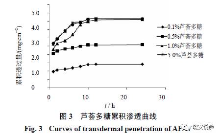 从这个图表来看,确实是浓度越高透皮量也越高,不过,到了5%似乎也就不怎么进步了,那么再高进不去皮肤也是没啥卵用的。而且,我觉得吧,其实健康皮肤的芦荟多糖透皮量应该比这结果更低,想想普通透明质酸在皮肤上的结局,还不是多数都变成了一层膜附着在皮肤表面?这也是我觉得所谓的抗氧化啊,调整免疫功能啊之类的功效不太靠谱的另一个原因。