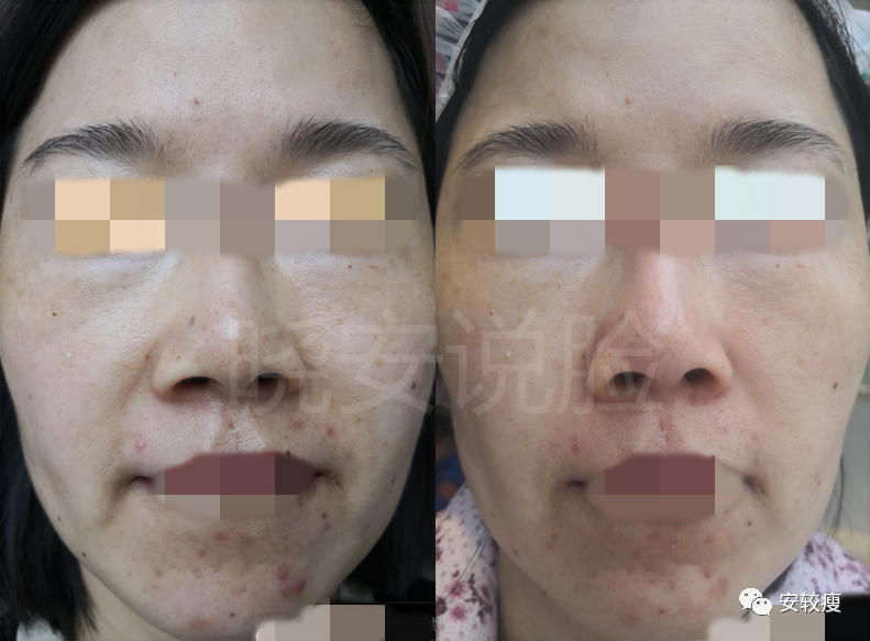 2020.6.18回访结果;效果持续进展,眼部静态纹几乎没有了;脸上的印第安纹也几乎完全消失,皮肤细嫩饱满,也不再红血丝,发红发烫;眼睛下面的斑也淡了: