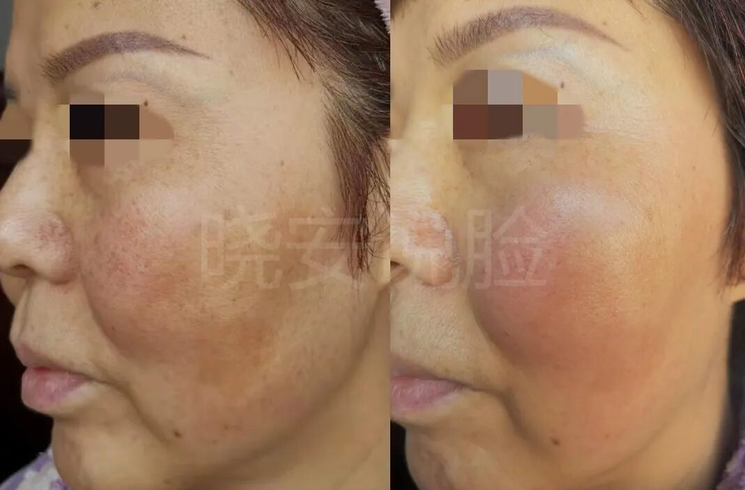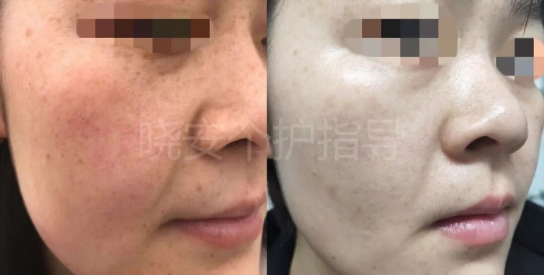 #晓安个护指导·常年美容院PK贵妇护肤品谁会胜出#53岁,坐标河南,T区微出油,两颊红血丝严重,斑片严重,两颊极其敏感干燥,感觉涂什么面霜都很干;常年遇冷遇热脸颊发红明显,咨询前自我感觉用美容院的某精油后改善很多;半个月之内去过三次美容院做嫩肤补水,每次做完后坚持天天贴面膜;以下照片是方案使用仅一周的对比: