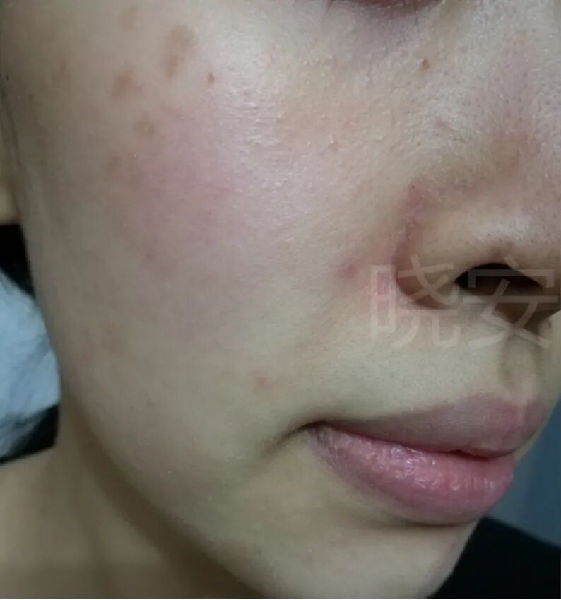 #晓安个护指导·疑难杂症型痘痘肌#23岁女,坐标北京;从小就容易冷热泛红,毛细血管扩张严重;2016年开始长痘,最严重时达到重度,去医院吃过中药,后在美容院买过中药粉混合乳液涂抹后开始出现严重过敏,眼睛肿,脸颊皮肤痒、起小疙瘩、发红,去医院用了面膜+外涂药膏,好转后,每次换了新的护肤品都会长小痘痘。