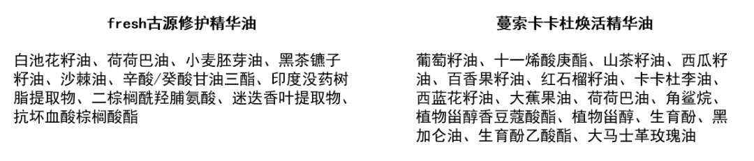 所不同的是,fresh主打的是白池花籽油,富含天然维E,有一定抗氧化作用。