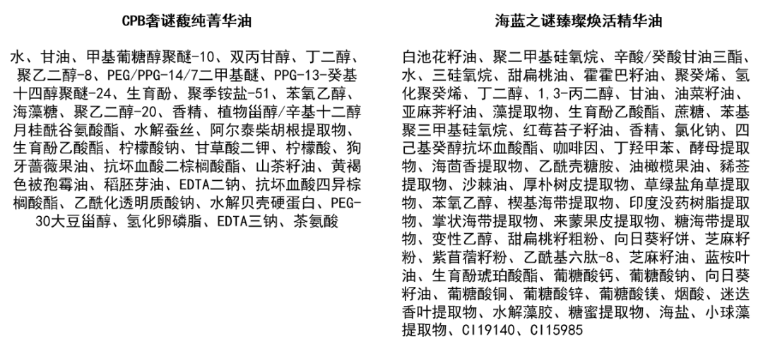 海蓝之谜精华油:白池花籽油、聚二甲基硅氧烷、辛酸/癸酸甘油三酯、三硅氧烷、甜扁桃油、霍霍巴籽油、聚癸烯、氢化聚癸烯、油菜籽油、亚麻荠籽油、苯基聚三甲基硅氧烷、红莓苔子籽油、油橄榄果油、沙棘油、芝麻籽油、向日葵籽油