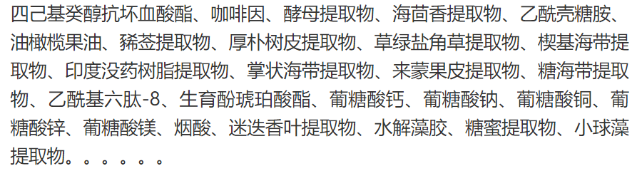 另一个,则是走的自家传统老路——十全大补添加风。嗯,配方表一定要长。。。最好能让评测配方的博主抄到手软,至于有没有用嘛?管它呢,先加进去再说!