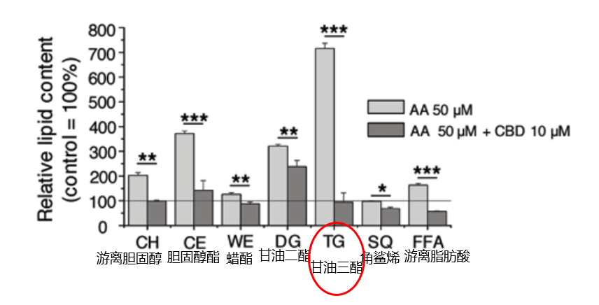 这个研究是用人类永生化的SZ95皮脂腺细胞做的实验,结果发现CBD可以使由花生四烯酸诱导的SZ95皮脂腺细胞的“病理”化脂质合成几乎完全恢复正常,尤其是甘油三酯的改变差距更是巨大的: