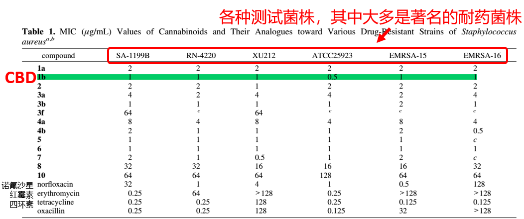 这个杀菌实验实际测了一大堆大麻素类物质,其中CBD表现优异(MIC值也就是最小抑菌浓度非常低)~再加上它潜在的抗炎能力(虽然外涂可能不太给力,但有总比没有好对吧),单纯从文献党的角度来看,这个大麻CBD还真可能是个很有潜力的抗痘成分~