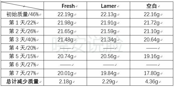 结论1.Fresh、Lamer相对于空白对照组都明显减少了大约一半的水分蒸发量,毫无疑问它们的封闭保湿性能都非常显著;