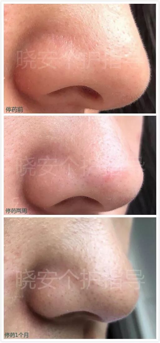 这个是我之前接的一个真人案例提供的对比图。第一张是用药后黑头消失的效果,最后一张是停药1月后黑头卷土出来的效果。