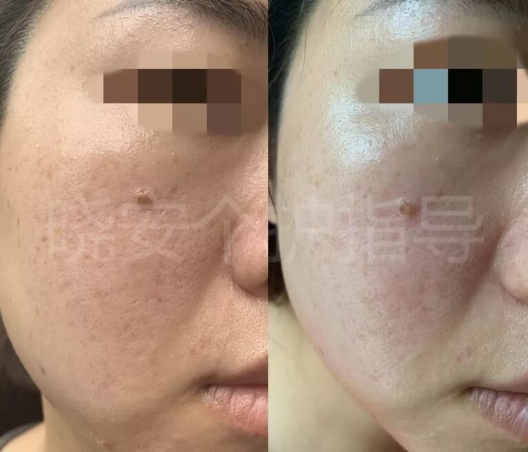 注意:这里不要看皮肤颜色的变化,不是变白了!不是变白了!不是变白了!因为她这个是使用第二天的效果对比而已。。。根本不可能是变白了,只是拍照光线略有差异而已(对照下两张照片的脖子颜色你就懂了)。其实,即便是使用很久,这样的对比照也是无法看出美白效果的,美白效果应该在同样光线同样角度下观察同一个斑点的颜色深浅变化比较有意义,而不是整体色调的变化。