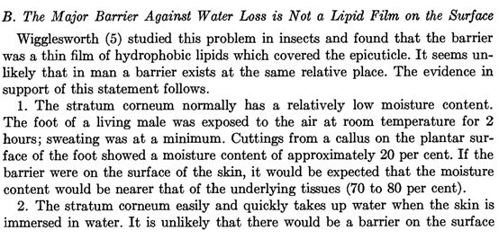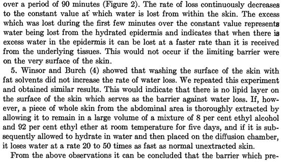 在23℃的环境下,将一块足跟皮肤的角质层通过浸泡蒸馏水的方式进行人工水合2.5小时,然后吸干除去表面的多余水分,放进温度23℃湿度50%的扩散室里监测,结果在90分钟内观察到,水分散失速率一开始非常快(估计是因为角质层水分过多导致的),快到可能远超它从下层表皮内吸收水的速率(我们角质层里的大量水分都来自于深层皮肤,这个速率在该文献发表当时还不能准确测得,所以这里用了“可能”一词),直到某个点以后才逐渐稳定(估计是角质层水分恢复正常以后)。然而,如果皮脂膜可以有效阻止水分散失,就不应该发生这种情况。