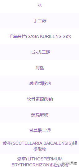 说到底还是个水啊,里面并不会自带甘油的啊,事实上,人家这个水倒是自带一点抗炎美白成分(以后看到“抗炎美白”几个字,请默默和收敛剂划等号,别问我为什么,以后说)!虽然,这种自带活性成分的水还是噱头偏多~
