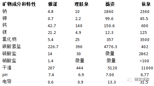 并且,根据此数据进一步的测算得知各种水的矿物质含量大约是:雅漾0.2g / L,理肤泉0.45g / L,薇姿5g/L、依云11g / L。